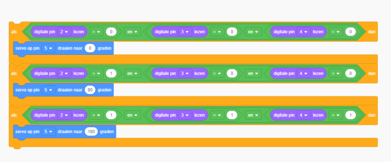 Bij het gebruik van geen enkele schakelaar moest de servo gewoon op 0 graden blijven staan. Gebruik je de rechtersschakelaar draait de servo naar 90 graden. En als je ze allemaal gebruikt moet de servo naar 180 graden draaien.